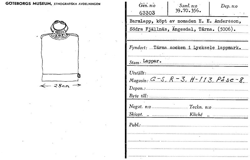 63303 GOTEBORGS MUSEUM, ETNOGRAFISKA AVDELNINGEN • Saml: n:o 355. Dep. n:o G -2 Barmlapp, köpt av nomaden E. E.Andersson, Södra Fjällnäs, Ängesdal, Tärna. (5006). Fyndort: ..__Tärna_socken..i..Ly.ek...