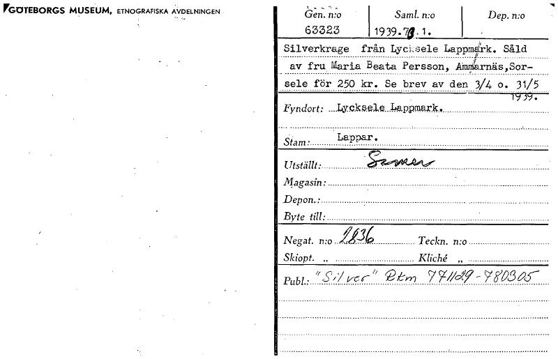 • FGOTEBORGS MUSEUM, ETNOGRAFISKA AVDELNINGEN Gert. n:o 6332.3 Saml. n:o 1939.73.1. Dep. n:o Silverkrage från Lycsele Lappmark. Såld av fru Maria Beata Persson, Annarnäs,Sor- sele för 250 kr. Se brev av... Visa hela