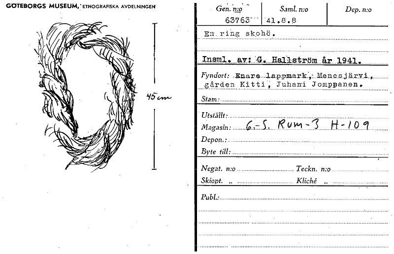 GOTEBORGS MUSEUM, ETNOGRAFISKA AVDELNINGEN A/5-C,VV■-• • Gen.n:p Samt. n:o 63763- 141 . 8 . 5 En, ring skohö. Insml. av: 4, Hallström ikr 1941. Fyndort: _Enaret...lapinaark....Me.ne.e..j..ä.r.v.i , gå...