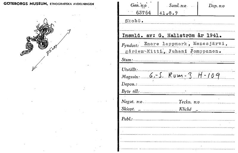 GOTEBORGS MUSEUM, ETNOGRAFISKA AVDELNINGEN Insmld. av: G. Hallström år 1941. Fyndort: Enare lappmark, Menesjärvi, - gårdeminttL.,,Juhani Jomppanen. Stam • Utställt • Magasin: 6,-5, RUM- 1-f jÖ 9 Dep...