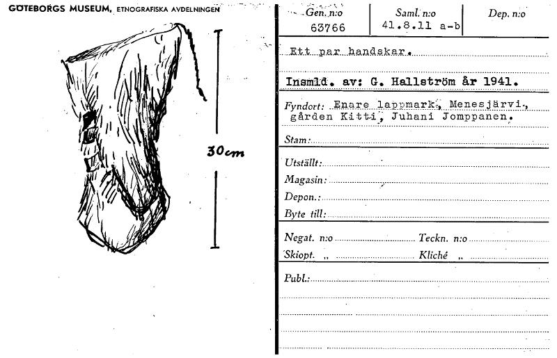 • GOTEBORGS MUSEUM, ETNOGRAFISKA AVDELNINGEN.' Samt. n:o Dep. n:o 63766 41.8.11 a-b Ett pax handskar, 1 Insffild. av: G. Hallström år 1941. Fyndort: Enare lappmark; Menesjärvi—, gården Kittd..; Juhani... Visa hela