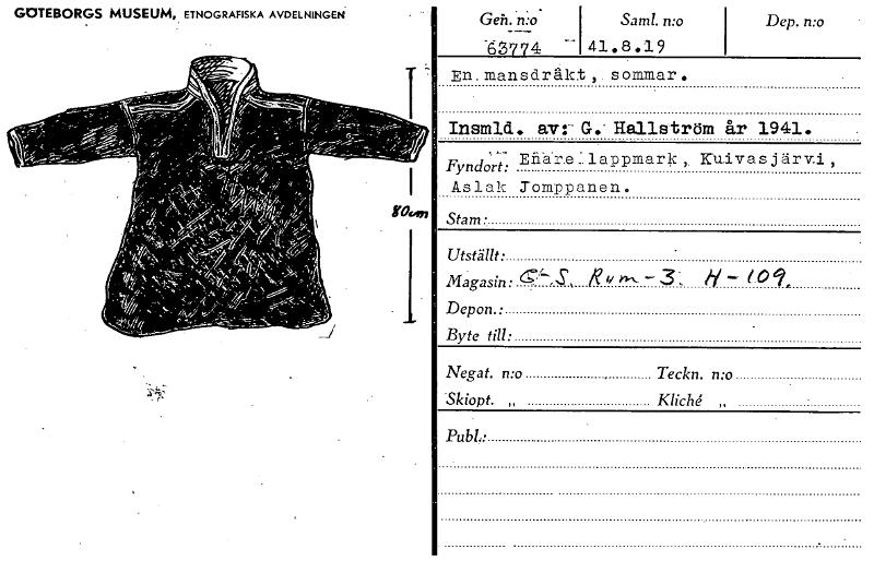 • GOTEBORGS MUSEUM, ETNOGRAFISKA AVDELNINGEN Dep. n:o -63774 —1 Geh.n:o Sam 1. n:o 41.8.19 En. mansdråkt , sommar. Insmld. av:- G.' Hallström år 1941. Fyndort; Efiär.e 1 lappmark ruivas j ärvd As lak To... Visa hela