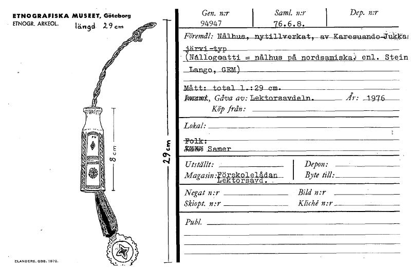 • ETNOGRAFISKA MUSEET, Göteborg ETNOGR. ARKEOL. längd 2.9 cm ELANDERS,G1313.1972. Gen. n:r 94947 83 ml. mr I 16.6.8. 1 Dep. mr . Föremål: Hå9husl_ryti11 verkat av y .Karesuando-JUU järvi-typ ' (Nållogoa... Visa hela