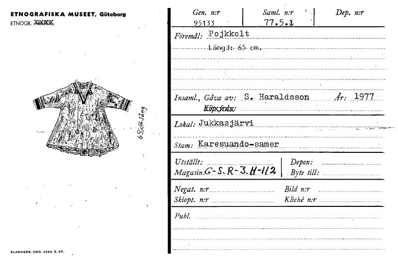 • ETNOGRAFISKA MUSEET, Göteborg ETNOGR. XRUEZ Gen. n:r I SamL n:r 95133 I 77.5.1 Förernx: Pojkkolt Dep. n:r Längd:. 65. cm. Insaml., Gåva av: S, Haraldsson År: 1977 let2cinix: Lokal: Jukkasjärvi Stam... Visa hela