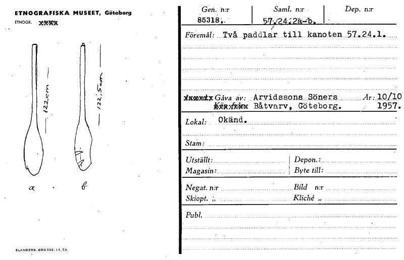 • Geri. n:r 85318, ISamt. n:r I Dep. n:r i 57:24:- 2-ä-:13-. ETNOGRAFISKA MUSEET, Göteborg ETNOGR. =ex Föremål: Två paddlar tili kanoten 57.24.1. ketaxdxGåvaåv: Arvidssons Söners År: 10/10 igghtkdoe ... Visa hela