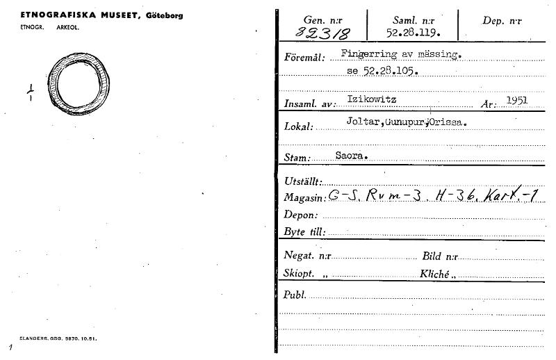 • Gen. n:r .S23/2 Saml. n:r 52.28.119. Dep. nr ETNOGRAFISKA MUSEET, Göteborg ETNOGR. ARKEOL. Föremål: Fingerring av mässing. se 52.28.105. Izikowitz Insaml. av: Lokal: Joltar,GunupurPrissa. Är. 1951 S... Visa hela
