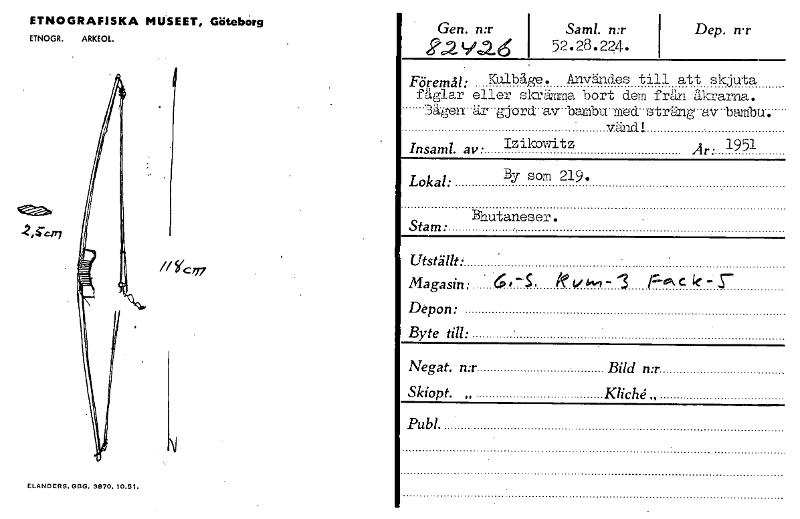 ETNOGRAFISKA MUSEET, Göteborg ETNOGR. ARKEOL. ii re ,77 ELANDERS. 0130. 3870. 10.51. Gen. n:r 22v,26 Saml. n:r i 52.28.224. 1 Dep. n.r Föremål: Kulbåge. Användes till att skjuta fåglar eller sie...ägna bort dem fräzi.åkrarna. Bågen är --gjord--av-bambu-med- sträng av- bLuribu. - vänd! Insaml. av • Izikowitz Är. 1951 Lokal: By som 219. Bhutaneser. Stam: Utställt: Magasin; . 6 — If ,,,„„..,_ 1 Fe" c k - s Doon• Byte till: Negat. n:r Bild n.r Skiopt. „ Kliché.. Pub!. [ocr]