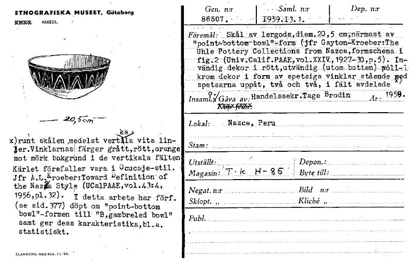 ETNOGRAFISKA .MUSEET, Göteborg Isawm ARKEOL. ka x)runt skålen ,medelst vertAla vita lin- jer.Vinklarnas färger grått,rött,orange mot mörk bakgrund i de vertikala fälten Kärlet förefaller vara i Ocucaj...