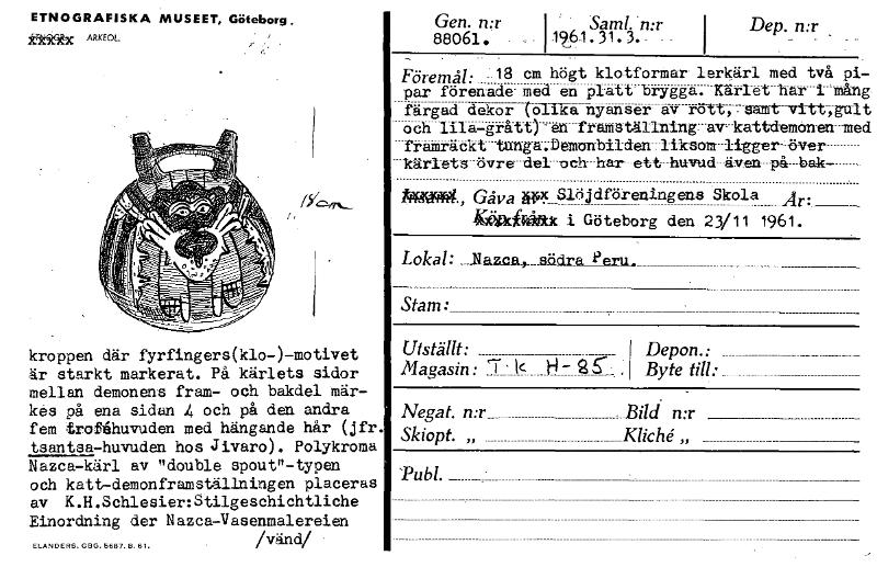 ETNOGRAFISKA 'MUSEET, Göteborg, irkfigbc ARKEOL 7.5/C—fro,_ kroppen där fyrfingers(klo-)-motivet är starkt markerat. På kärlets sidor mellan demonens fram- och bakdel mär- kes på ena sidan i och på den andra fem trofåhuvuden med hängande hår (jfr. tsantsa-huvuden hos Jivaro). Polykroma Nazca-kärl av "double spout"-typen och katt-demonframställningen placeras av K.H.Schlesier:Stilgeschichtliche Einordning der Nazca-Vasenmalereien ELANDERSGBG 5687861. /vänd/ g d Gen. n:r 88061, ,. i Saml..n:r 1961 .31.3._ .. i Dep. n:r - - Föremål.. - 18 cm par förenade med högt klotformar lerkärl med två pi en platt-brygga. Kätlet hsr-i'mån nyanser- av rott,-samt-vitt,gul en framställning-av-kattdemänen-me -även på bak Slöjdföreningens Skola Ar: framrackt tunga-.-DemonbiIdenTliksom-Iigger-över -kärlets-övre-deI-och-har-ett-huvud färgad. dekor (-611.ka och Illa-grått) 4#84, Gåva äys Kismustic i Göteborg den 23(11 1961. Lokal: ILlaca, sädra Peru- Stam: Utställt: Depon.: Byte till: _ Magasin: i ' lc H- 25--.. Negat. lyr , Bild n:r KlicU „ Skiopt. „ 'Pub!. [ocr]