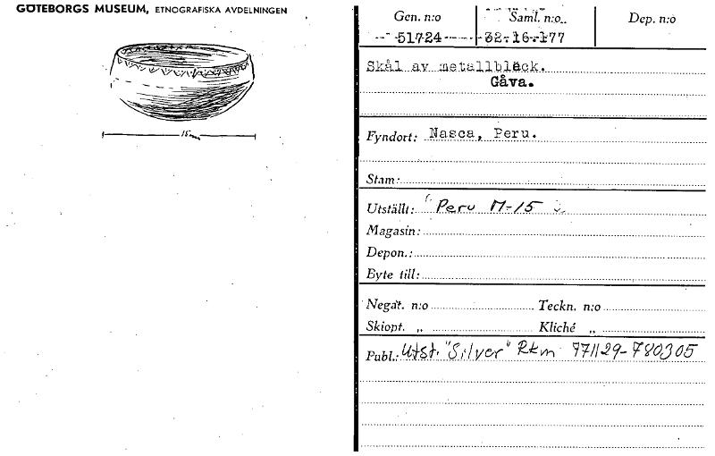 • GCITEBORGS MUSEUM, ETNOGRAFISKA AVDELNINGEN Gen. n:o WaM1.-n:p.. Dep. n:O " -51'724--- 2: 16-i-177 Bida .ay me.1.4,1b1äck. Gåva. Fyndort: Nasca, Peru. Stam • r. Utställt:....... reru Magasin: Depon.:... Visa hela