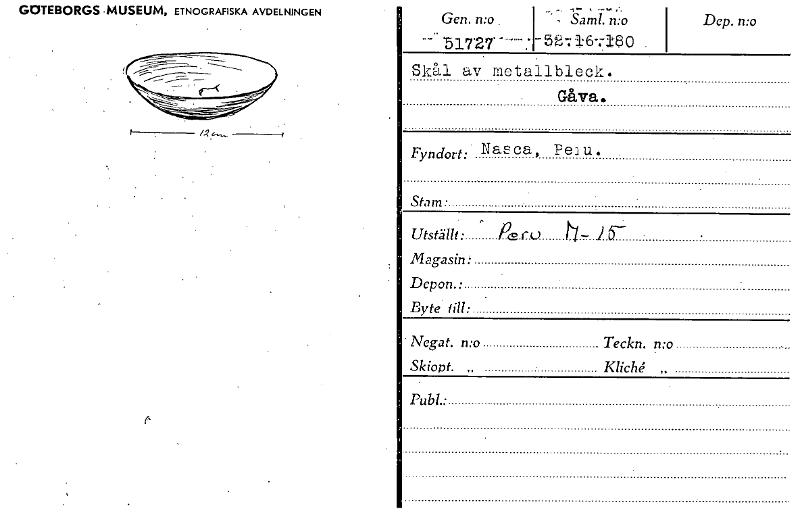 • GOTEBORGS -MUSEUM. ETNOGRAFISKA AVDELNINGEN Gen. n:o . Saml. n:o '51727 . Skål av metallbleck Fyndort: Nas ca , Pea u. Dep. n:o Gåva. Stam • Utställt • re.c.0 Magasin: Depon. • Byte fin: • Negat. n:o... Visa hela