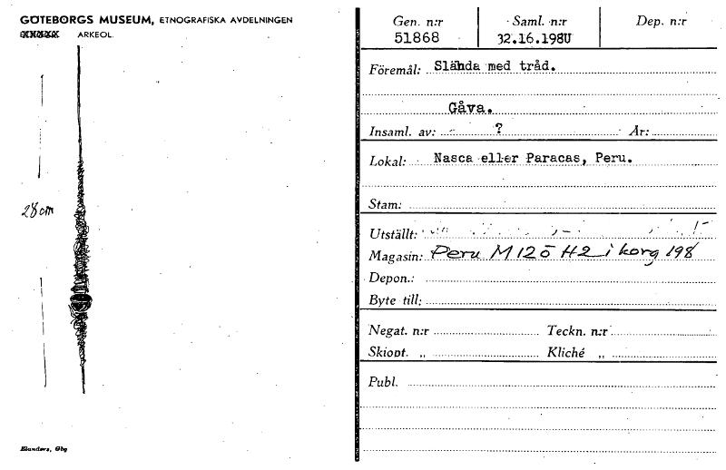 • GOTEBORGS MUSEUM, ETNOGRAFISKA AVDELNINGEN ariel= ARKEOL. Gen. n:r 51868 - Saml. -n:r 32-.16.198U Dep. n:r Föremål: Släida med tråd. Gåva . Insaml. av: - Är: Lokal: • Nasca -eller Paracas, Peru. Sta... Visa hela