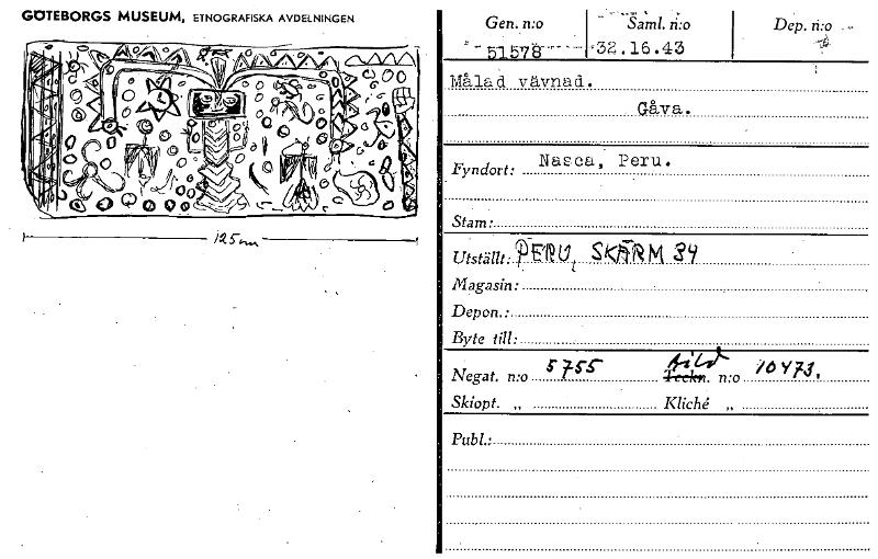 • GOTEBORGS MUSEUM, ETNOGRAFISKA AVDELNINGEN Gen..n:o Sam!. n:o .32.16.43 Målad vävnad. Gåva. Nasca, Peru. Fyndort: Stam. utställt: E' U Sic5104 39 Magasin: Depon.: Byte till: 4»7» 4.».‘» 709,1, Negat.... Visa hela