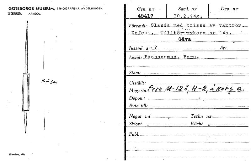 • Gen. n:r • Saml. n:r Dep. n:r 45417 30 2 . 1 4g . 'Föremål: Slända med trissa_av värt.rör- Defekt. Tillhör—sykorg nr 14a. Gåva • Insaml. av • ? Är• Lokål: Pachacamso PerAA Stam: utsänt: z . ma... Visa hela