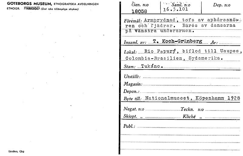 GOTEBORGS MUSEUM, ETNOGRAFISKA AVDELNINGEN ETNOGR. InÄggöP. (Det icke tillämpliga sfrykes) Elanders, Gbg .-ten. n:o 16058 Sa. no 16.5.101 Dep. n:o Föremål: Armtrydnad, tofs av aphårssnä ren'Obh-fjädrar. Bäres av dansarna på vänstra underarmen. Insaml. av: T. Ko eh-Grtinb e rg År: Lokal: Rio Pepurl, biflod till. Uaupes , Colombia-Brasilien 1 Sydamerika. Stam: ....Tukdno • Utställt: Magasin: Depon.• Byte till: Nationalmuseet, Köpenhamn 1.28 Negat. n:o Teckn. n:o Skiopt. „ Kliché Publ.: [ocr]