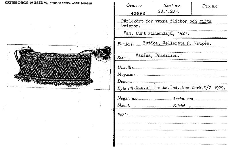 Samt. n:o 28.1.203. Pärlskört för vuxna flickor och gifta kvinnor. Sam. Curt Nimuendajli, 1927. Fyndort: Yutica, Mellersta R. Uaupes. Vanna, Brasilien. Stam • Utställt • Magasin: Depon.: Byte fill:Mus.of the Am.Ind.,New York,9/2 1929. Negat. n:o Teckn. Skiopt. P/ Kliché „ GOTEBORGS MUSEUM, ETNOGRAFISKA AVDELNINGEN ay.a.gomt:pumun:Rantettutntqww.w.smstmuuto...rztur,4g:24,..'n""'...9'5 Gen. n:o 43283 Dop. n:o Pub!.: [ocr]