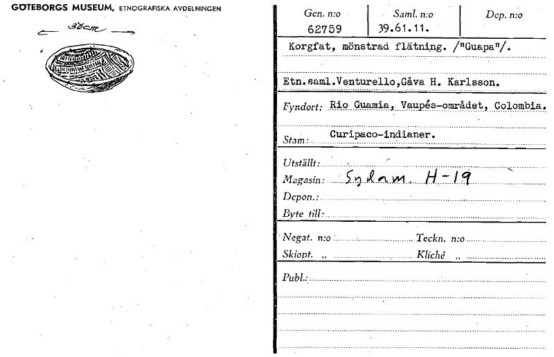 GOTEBORGS MUSEUM, ETNOGRAFISKA AVDELNINGEN i . Sam!. n:o39.61.11. • Korgfat, mönstrad flätning. /"Guapani. Etn.saml.Venturello,Gåva H. Karlsson. Fyndort: Rio Guamia, Vaupes-området, Colombia. Curipaco -indianer. Stam • Utställt: Magasin: " Depon.: Byte till: Negat. n:o Teckn. n:o Skiopt. „ Kliché „ Gen. n:o 62759 Dep. mo [ocr]