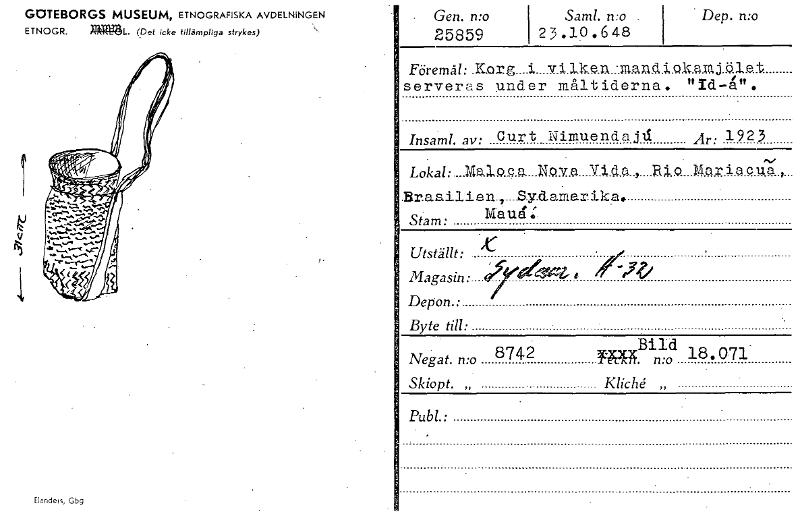 GOTEBORGS MUSEUM, ETNOGRAFISKA AVDELNINGEN ETNOGR. 44181.. (Det icke tillämpliga strykes) Elandels, Gbg Gen. n:o • 25859 Saml. n:o . 25.10.648 . Dep. n:o Föremål: .K.org i v 1.1.k.e.n...mand.19.1z.lajA5le t serveras under måltiderna. "Id-g.". Insaml. av: Curt Nimuen.d a j ti Ar: 1923 Lokal: .141-a.loca Rova. Vida, Rio Mariacti%/a , .Braailien.,....Sy.d.ame.rika. Stam: Mäud c'. Utställt: Magasin:. dc7a4 s Depon.: Byte till: Bild Negat. n:o 8742 ncela mo 18.071 Skiopt. „ Kliché „ Publ • N [ocr]Stäng