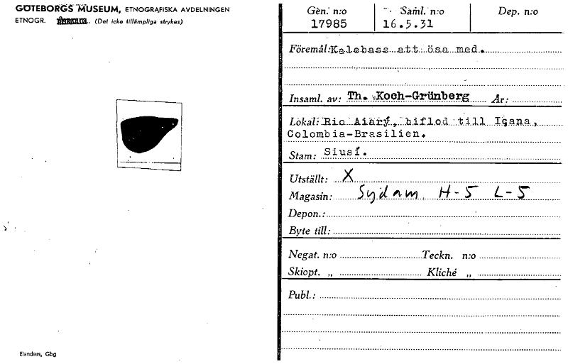 GOTEBORGS 'MUSEUM, ETNOGRAFISKA AVDELNINGEN ETNOGR. ~DL (Det icke tillämpliga strykas) Elanders, Gbg Gen: n:o 17985 - . Smid:n:0 16.5.31 Dep. mo Föremå/a.ieba,s2,....a.t.t.:..ö.s.a...med.. , - Insaml. av: Th. kKooh-Grtinberg Ar: LåkaVIRia.:.Aikitl.,1.b.i.f1.0.(1 .. : . till I4ana , Colombia-Brasilien. Stam: Slus • Utställt: X Magasin: 5 iIt, liti , H- 5— L- 5- Depon.• Byte till: Negat. n:o Teckn. mo Skiopt. „ Kliché „ Publ.• [ocr]