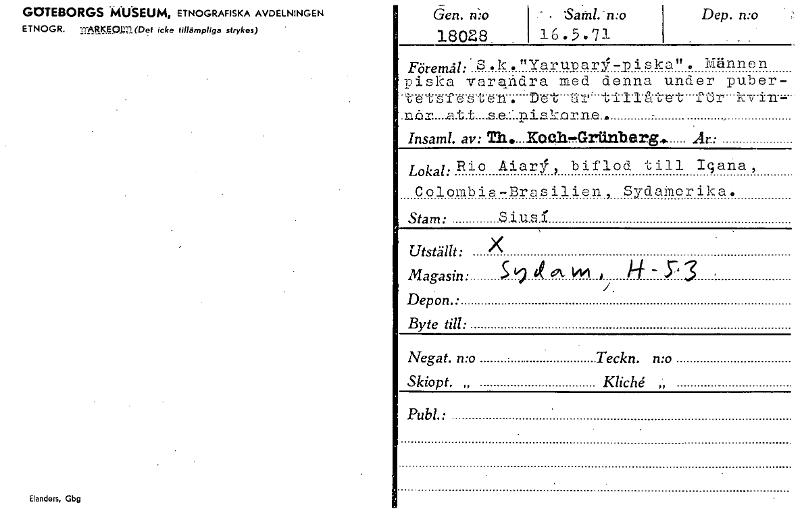 • GOTEBORGS MUSEUM, ETNOGRAFISKA AVDELNINGEN ETNOGR. rARKE.Q.M(Det icke tillämpliga strykas) Elanders, Gbg Gen. riä 18028. - . Sain1.-n:o 1 6 . .5 . 7 1 Dep. n:o Föremål:- S .k . " Yarup a rY: 7.1) i sk... Visa hela