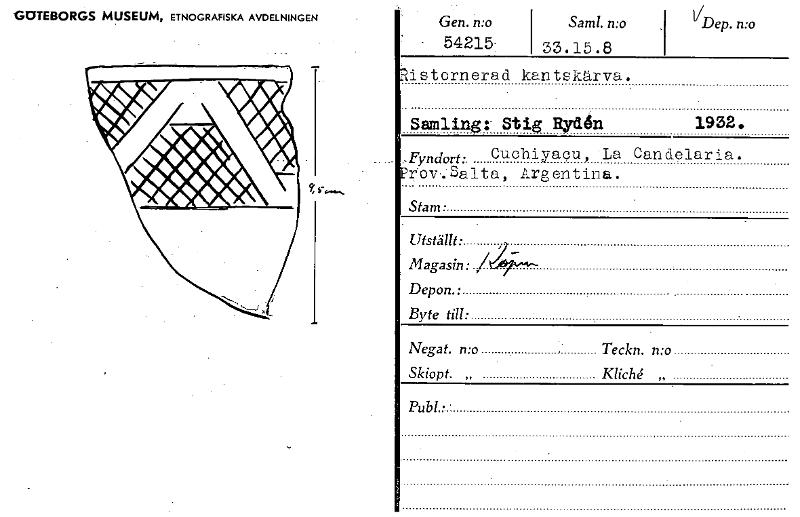 • GOTEBORGS MUSEUM, ETNOGRAFISKA AVDELNINGEN Gen. n:o - 54215: Samt. n:o 33.15.8 VDep. n:o istornerad kantskärva. Samling: Stig Rydén 1952. ,Fyndort:. Cuchiyaqu, 'La Candelaria. rov..'Salta, Argentina.... Visa hela