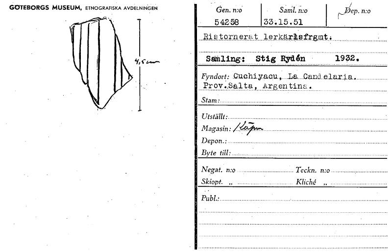 • GOTEBORGS MUSEUM, ETNOGRAFISKA AVDELNINGEN Gen. n:o • Satra. n:o - ep. mo n 542.58 33.15.51 Ristornerat lerkärisfrgmtå SObling: Stig Rytign rna. Fyndort: .Cuchi.y.p.ou.,....La...Cand elar i a. Prov..S... Visa hela