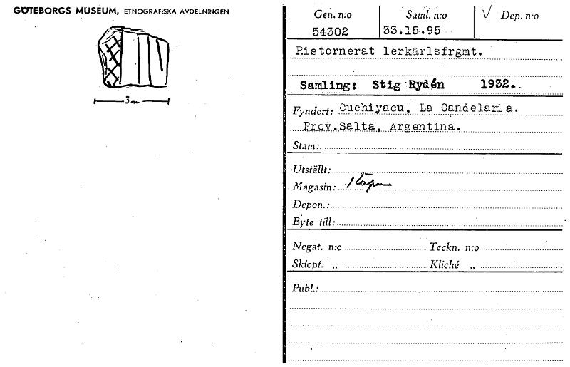 • GOTEBORGS MUSEUM, ETNOGRAFISKA AVDELNINGEN Gen. n:o -i 3~ 54302 . . 33.15.95 • Samt. n:o Ristornerat lerkärlsfrgmt. VDep. n:o Samling: Stigitydån 1932.. Fyndort: Cuehiyaeu, La Candehtri a. Prov.Salta,... Visa hela