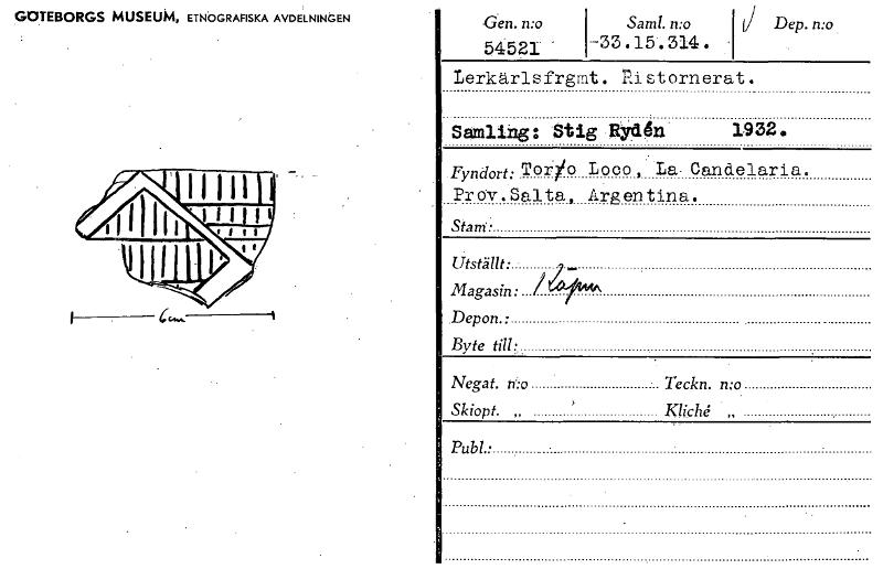 • GOTEBORGS MUSEUM, ETNOGRAFISKA AVDELNINGEN Gen. n:o Saml. n:o 54521 -33.15.314 . Lerkärl s frgrnt ni stornerat. Dep. n:o Samling: Stig Eiddn 1932. Fyndort: . o Loco , 'La- Candelaria. .... Prov. Salta... Visa hela