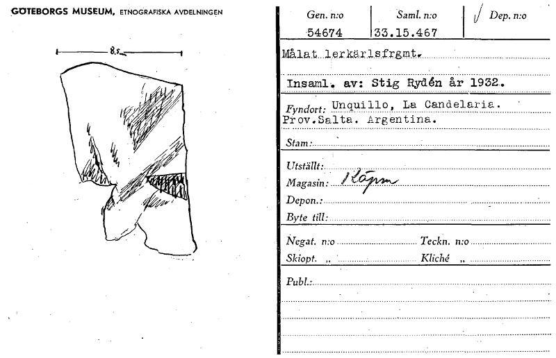 • GOTEBORGS MUSEUM, ETNOGRAFISKA AVDELNINGEN Gen. n :o .54674 Sam!. n:o 33.15.467 (i Dep. n:o Måla.t_1,.exkäilsfrgmt, Insaml. av: Stig Rydén år 1932. Fyndort: Unquillo, La Candelaria. Prov.Salta. Argent... Visa hela