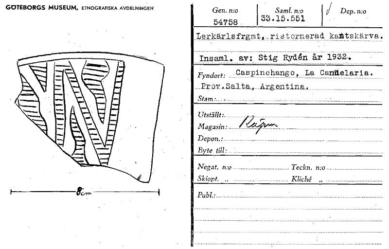 • GOTEBORGS MUSEUM, ETNOGRAFISKA AVDELNINGEN Gen. n:o 54758 . Saml.n:o 33.15.551 jDep. n:o terkärlsfrgmtt_ristornerad kaltshärva. Insaml. av. Stig Rydån år 1932. • Fyndort: Caspinchango, La Candelaria.... Visa hela