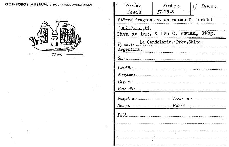 GOTEBORGS MUSEUM, ETNOGRAFISKA AVDELNINGEN Gen; n:o Samt. n:o V' Dep. n:o , 58948 37.15.8 Större fragment av antropomorft lerkärl (Skå1formigt3. Gåva av ing. 80 fru G. Wzman, Gtbg. Fyndort: La Candel...