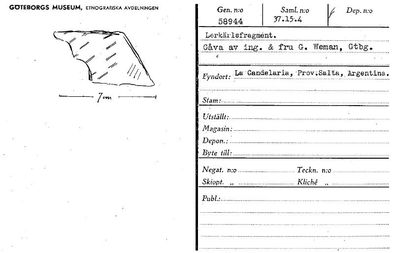 • Sam!. n:o GOTEBORGS MUSEUM, ETNOGRAFISKA AVDELNINGEN Gen. n:o 58944 fDep. n:o Lerkärlsfragnient. Gåva av ing. & fru G. Weman, Gtbg. Fyndort: La-Candelaria, Prov .Salta, Argentina. Stam • Utställt • Ma... Visa hela