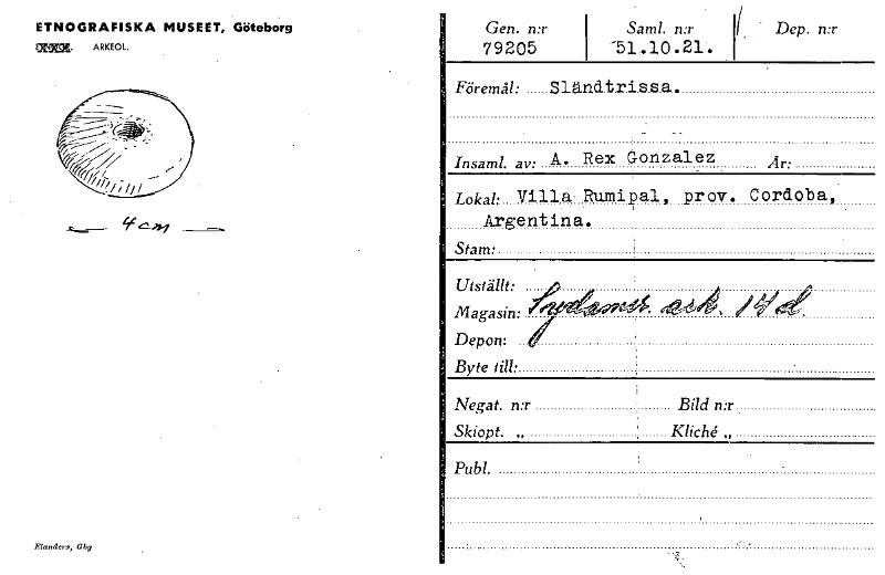• ETNOGRAFISKA MUSEET, 'Göteborg mkum ARKEOL Gen. n:r Sam!. n:r 79205 -51.10.21. Dep. n:r Föremål: Sländt.ri.s.s.a. Insaml. av: A. Rex Gonzalez Lokal: Villa Riunipal, prov. Cordoba, Argentina. Stam: U... Visa hela