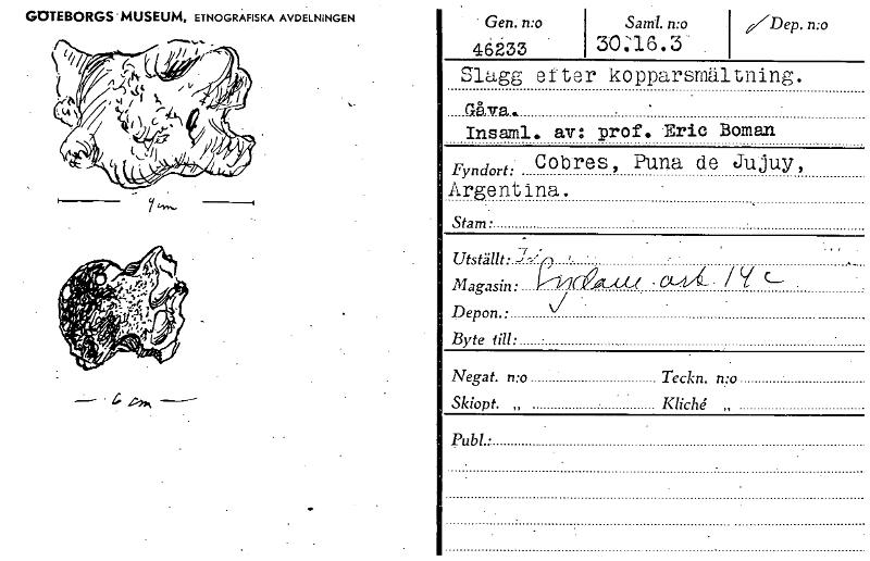 • GOTEBORGS -MUSEUM, ETNOGRAFISKA AVDELNINGEN • Gen. n:o 46233 Sand. n:o 30:16.3. . Dep. n:o Slagg etter kopparsmaltning. Gåva. Insaml. av: prof. Eric Boman Fyndort: Cobres, Puna de Jujuy, Argentina. S... Visa hela