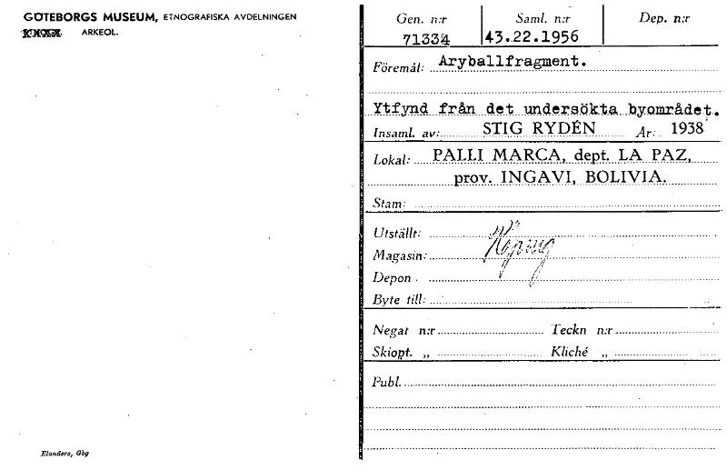 • Gen. n:r Sam!. n:r Dep. n:r 22.1956 71334 43. Föremål: Aryballfragment. Ytfynd. från det urideroök.t.a..byområdet_. Insaml. av• STIG RYDÉN Ar: 1938. Lokal: PALLI MARCA, dept. LA PAZ, GOTEBORGS MUSE... Visa hela