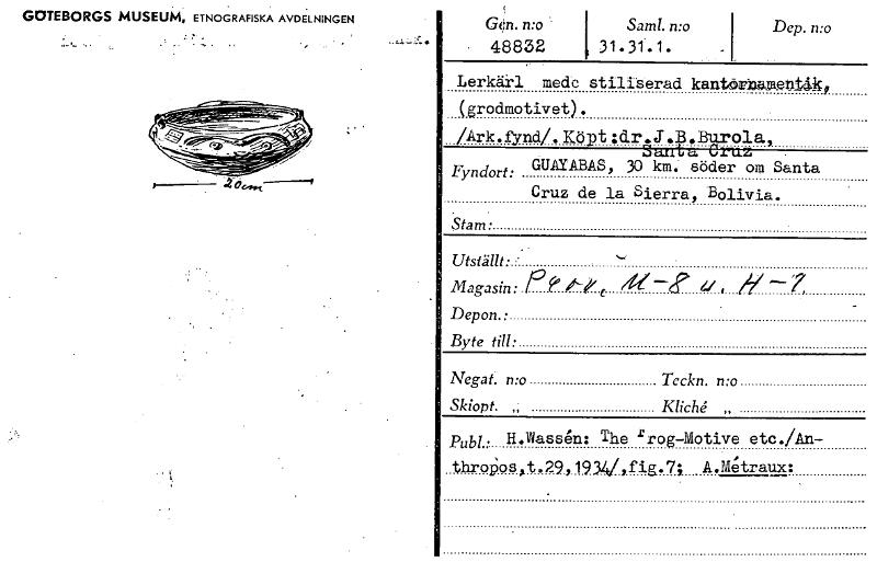 GOTEBORGS MUSEUM, ETNOGRAFISKA AVDELNINGEN GO. n:o - • 48832 Samt. n:o 31.31..1. _1 Dep. n:o Lerkärl mack stiliserad kant4rnamelltesik, (grodmotivet). /Ark.ryne. Köpt :dr.J.B.Burola, Sewles. Fyndort:...