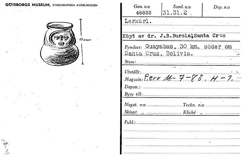• GDTEBORGS MUSEUM, ETNOGRAFISKA AVDELNINGEN Gen. mo Sam!. tro. 48833 31.31.2 Dep. mo Lerkärl. Köpt av dr. J.B.Burol4Santa Cruz Fyndort: . Uayabas, 30 km. söder om. Santa Cruz, Bolivia. Stam • Utställt... Visa hela