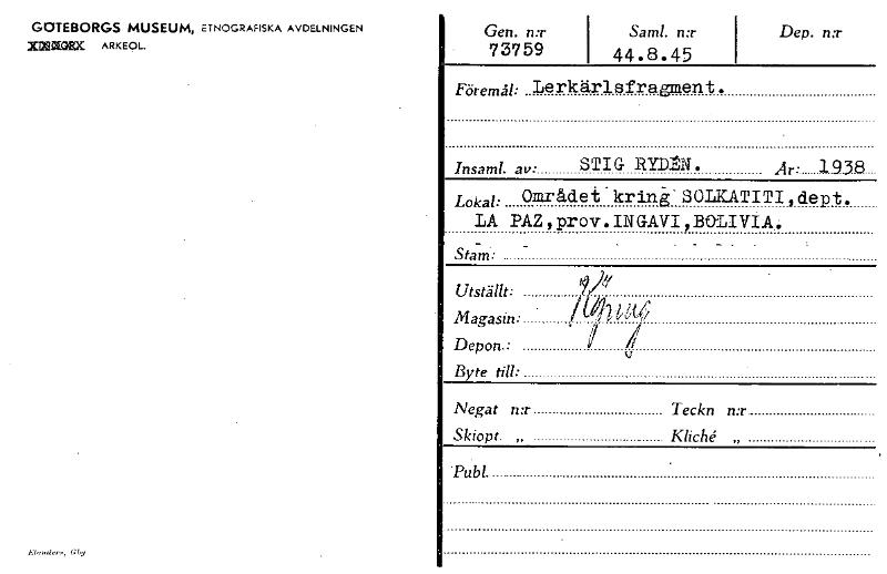 • GOTEBORGS MUSEUM, ETNOGRAFISKA AVDELNINGEN XCOZORX ARKEOL. (;by Gen. n:r 73759 Sam!. n:r 44.8.45 Dep. n:r Föremål: Lerkärlsfragment. Insaml. av: STIG RYDÉN. Är: 19.38.... Lokal: Området.kridg'SO... Visa hela