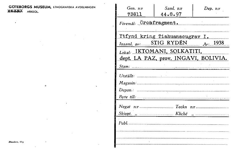 GOTEBORGS MUSEUM, ETNOGRAFISKA AVDELNINGEN X«12SariQC ARKEOL. Klanders. Gby Gen. n:r 73811 I Sam!. n:r 44.8.97 Dep. n:r Föremål: Örobfragment. Ytfynd kring Tiahuanacugrav I, Insaml. av. STIG RYDÉN ...