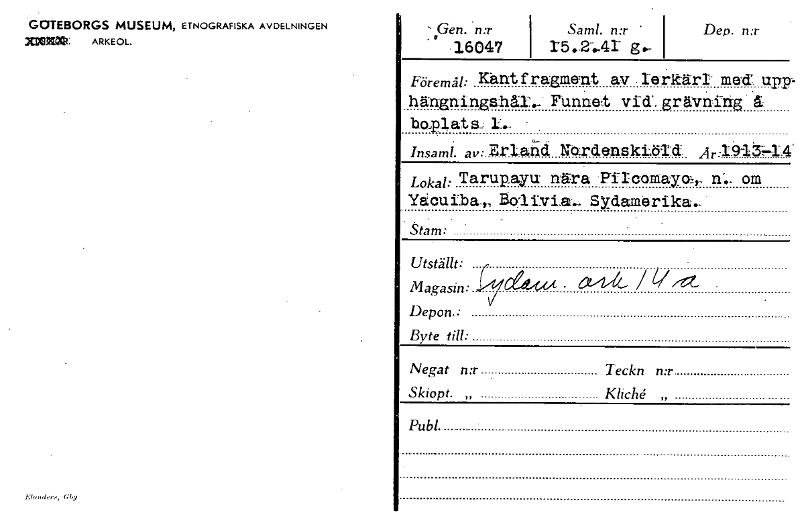 GOTEBORGS MUSEUM, ETNOGRAFISKA AVDELNINGEN mom ARKEOL. Kl, 1,,, Gby . 0 Gen. n:r 16047 Sam!. n:r ' i 15.2-..4r g.. Dep. n:r Föremål: Kent fragment av . lerkärl med',I upp hängningshål„- Funnet vid. grävlirrig..ä, boplats' 1.. - Insami. av: Erland NUrdensktöld. Ar:I"9-114 , Lokal: Tarupayu nära -PfIcomayai,,, n", om Yego.utba,„ Bo.113.rta, Sydamerika.. Stam: Utställt: . Ma • Ceeb GC , t . 01/1Å- / Magasin: Depon : Byte till: Negat n:r Teckn n:r. Skiopt. „ Kliché . Publ. • [ocr]