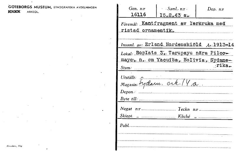 GOTEBORGS MUSEUM, ETNOGRAFISKA AVDELNINGEN INIXORN: ARKEOL. Elunders, Gby , , Gen. n:r , ,. 16116 ' - • Sam!.. n:r. 15.2.43 a..- Dep. n:r Föremål: Kant fragment av lerkruka mad- ristad_ ornamentik; Insaml. av: Erland.. Nordenskiöld Ar:1913744 Lokal: Bollats 3::1. Tarupayu nära Pil.co.;=.- mayco,., n.. om Yacuib.a-,_ B'orivia-,_ SYclame- .:rika.- Stam: , Utställt: Magasin: 66-ANt' ' 6-4-A--'` V Depon.: ' Byte till: Negat n:r Teckn n:r. Skiopt. „ Kliché „ ' Publ. [ocr]