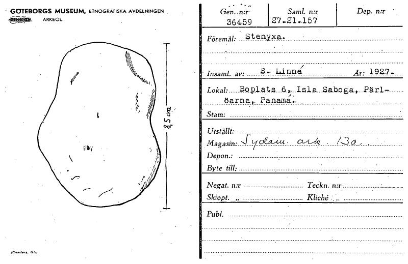 • • GOTEBORGS MUSEUM, ETNOGRAFISKA AVDELNINGEN ARKEOL. •••••••• _ . Gen. n:r Saml. n:r Dep. n:r 27.-21.-157 36459 Stenyxa. Föremål: Insaml. av: • Linne' 1922. Lokal: Boplats 6., Isla Saboga,. Pärt- öa... Visa hela