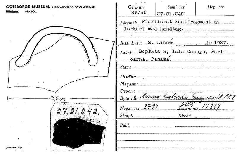 GOTEBORGS MUSEUM, ETNOGRAFISKA AVDELNINGEN SEffileffigt ARKEOL. Gen.r.n:r 3 67 6 2 Sam!. n:r 2-7. 21 . Dep. n:r .43, 09.2 g Y, ,Elanders. GbD Föremål: Profilerat kantfragment av lerkärl med :handtag. Insaml. av: 1922. Lokal: ' Boplats a, Isla Casaya, Pärl- öarna, Panama Stam: Utställt: Magasin: Depon.. Byte till: 'jj"1-a°--1-- 4 A-44, kt.44.2,62.9.4.9,f Negat. n:r g7 _bacjfit.n:r 31/ su)pt. „ Publ. [ocr]