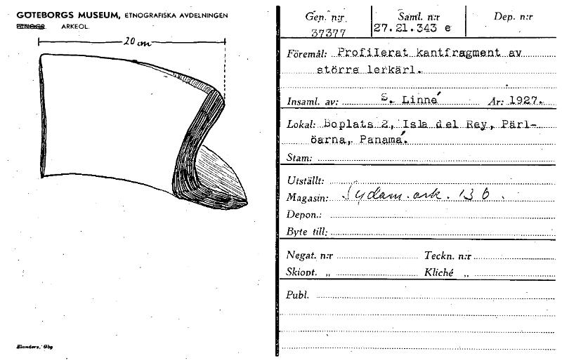 • GOTEBORGS MUSEUM, ETNOGRAFISKA AVDELNINGEN R. ARKEOL. _ Gen. n:r Samt n-x 27.21.343 e- 37377 Dep.. n:r 2° Föremål: Frof.i.I.e.r.at. kant.fragaient. .av st.ö.r.re _Lex:kärl- Insaml. av: c Linne. År: ... Visa hela
