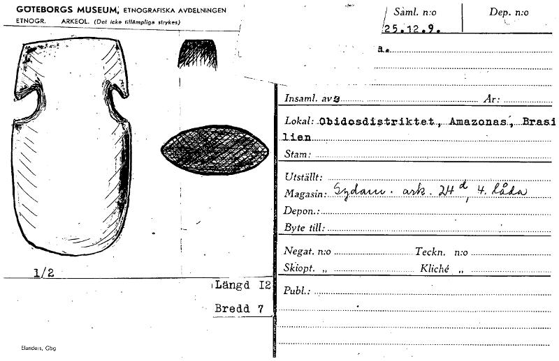 Dep. n:o Såml. n:o ,2 5 . 12 . 9 . a.. ElandeJs, Gbg GOTEBORGS MUSEUM; ETNOGRAFISKA AVDELNINGEN ETNOGR. ARKEOL. (Det icke tillämpliga strykes) 1/2 I Längd 12 Bredd. 7 Insaml. ave Ar: Lokal: .0bidosd...