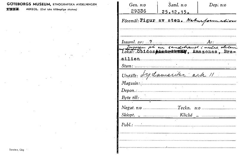GOTEBORGS MUSEUM, ETNOGRAFISKA AVDELNINGEN KIWZ:22. ARKEOL. (Det icke tillämpliga strykes) Elandels, Gbg ' Gen. n:o ' 29336 i Saml. n:o . 25,12.15. i Dej): mo Föremä.rigur av sten, /1644=4,17(0.4.---„...