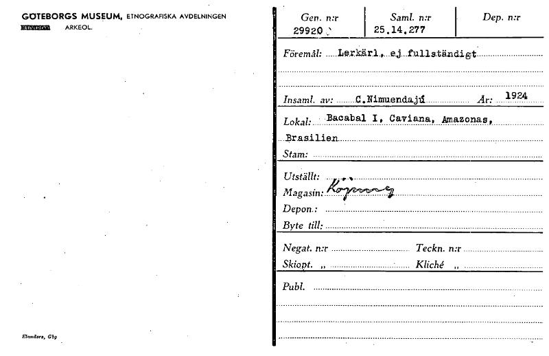 GOTEBORGS MUSEUM, ETNOGRAFISKA AVDELNINGEN Meeil ARKEOL. Gen. n:r 29920 .` Samt mr 25.14.277 Dep. n:r Föremål: Lerkärl.,...e.j..fullatändigt 1924 In saml. av: C.Nimuendajd År: Lokal: Bacabal I, Caviana, Atnazonas, Brasilien Stam: Utställt: Magasin: Depon.• Byte till: Negat. n:r Teckn. n:r Skiopt. „ Kliché „ Publ. -r -Ta Plandere, Obg [ocr]