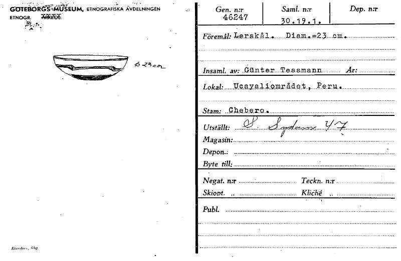 G-(YrådRa4agiUM, ETNOGRAFISK>, AVDELNINGEN ETNOGR. wikva. tri..• • Elander8, Gbg , Gen. n:r 46247 Saml. n:r i 30.19.1. Dep. n:r I Föremål: Le.rs.kål... Diam...-2.3. cia. Insaml. av: .0.11n.t.e.r....T.e.s.s.mann .Ar: Lokal. Ucayal i:området , Peru. Stam: ..Chebero.. Utställt: i - Magasin: . , Depon.• , * Byte till: Negat. n:r Teckn. n:r Skioot. „ Kliché ,. PubL [ocr]