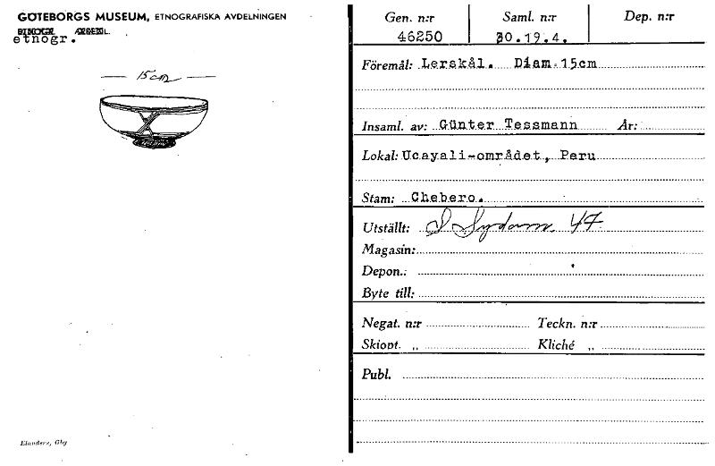 GOTEBORGS MUSEUM, ETNOGRAFISKA AVDELNINGEN IMIGE. etnogr. Elrolder,, G by Gen. n:r 46250 Samt. n:r 30 . 1 9 . 4. Dep. n:r Föremål: .14er.s.k.å.l.. Di ain..15.eni Insaml. av: ...Gil.p.t ex T e e.amann ...