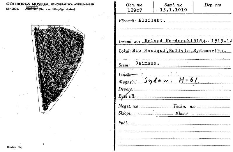 GOTEBORGS MUSEUM, ETNOGRAFISKA AVDELNINGEN ETNOGR. (Det Icke tillämpliga strykas) Elanders, Gbp Gen. mo 13907 Saml. n:o 15.1.1010 Dep. n:o Föremål: Eldfläkt . Insaml. av: Erland Nordenski öldÄr: . 19...